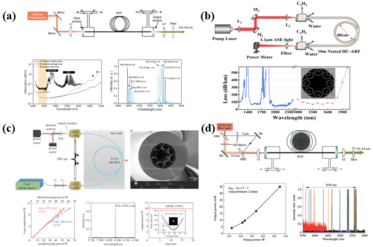 圖1 基于粒子數反轉的HCFGL代表性實驗裝置示意圖和結果。(a) 4.8 μm空芯光纖CO氣體激光;(b) 高功率空芯光纖C2H2氣體激光;(c) 高功率空芯光纖HBr氣體激光;(d) 大范圍階躍調諧輸出的空芯光纖HBr/CO混充氣體激光