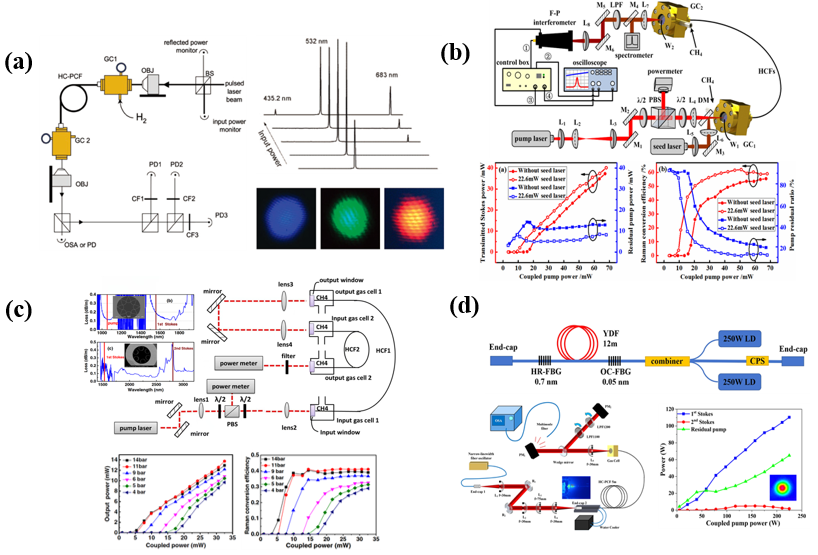 圖2 基于SRS的HCFGL代表性實驗裝置示意圖和結果。(a) 個HCFGL;(b) 1.5 μm波段空芯光纖甲烷氣體激光;(c) 級聯結構的中紅外波段HCFGL;(d) 110 W高功率HCFGL